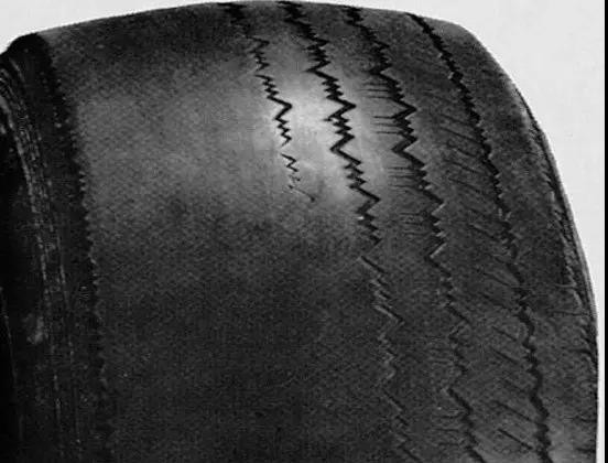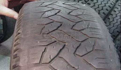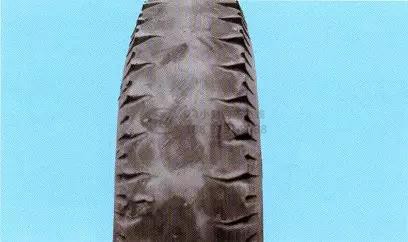 发现轮胎着地部分的中心面积出现严重磨损的情况,这表明轮胎经常处于充气过满的状态。这种轮胎很容易爆胎,多加小心。