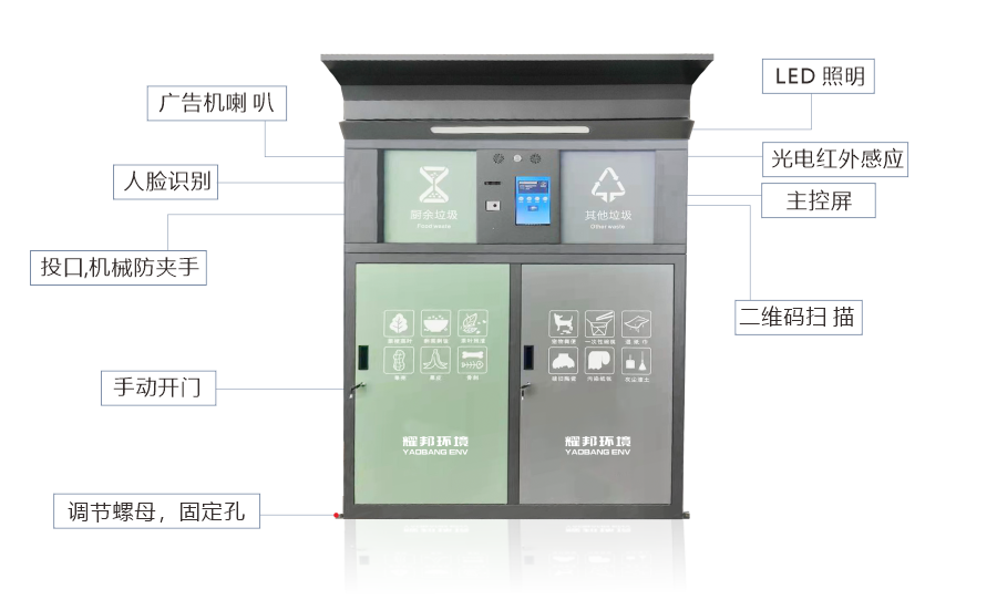耀邦环境智能垃圾分类回收设备,依托先进的人工智能、大数据、物联网、云计算、AI等技术,对垃圾分类各环节进行智能化管理。该设备拥有人脸识别、二维码识别等多种体验方式,配置自动称重、智能投递、便捷照明、烟雾报警等功能。自主研发生产、外观精致时尚、科技感爆棚,引领垃圾分类新潮流。