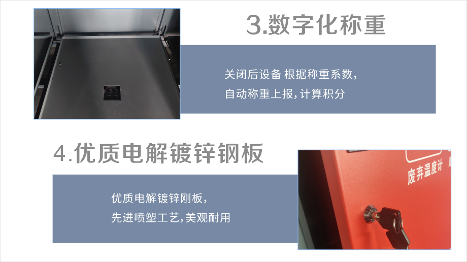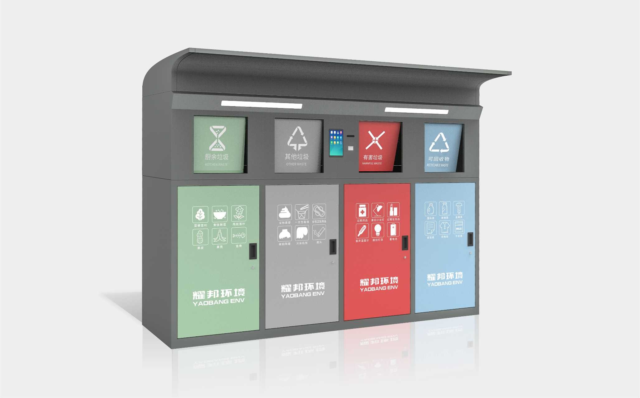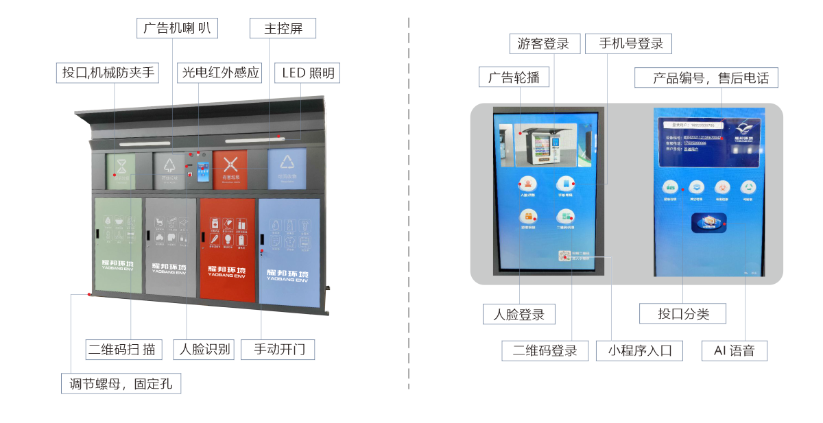 耀邦环境智能垃圾分类回收设备,依托先进的人工智能、大数据、物联网、云计算、AI等技术,对垃圾分类各环节进行智能化管理。该设备拥有人脸识别、二维码识别等多种体验方式,配置自动称重、智能投递、便捷照明、烟雾报警等功能。自主研发生产、外观精致时尚、科技感爆棚,引领垃圾分类新潮流。