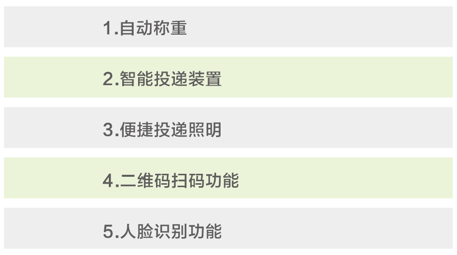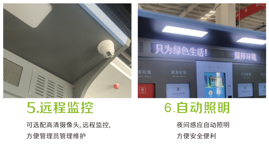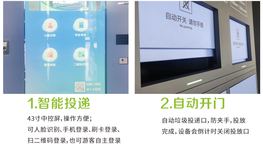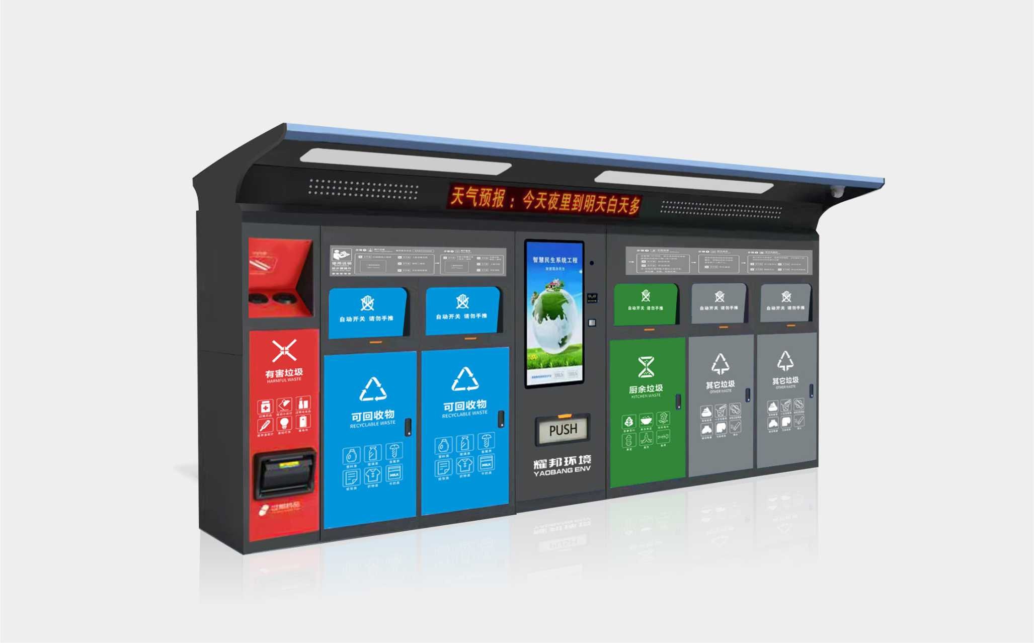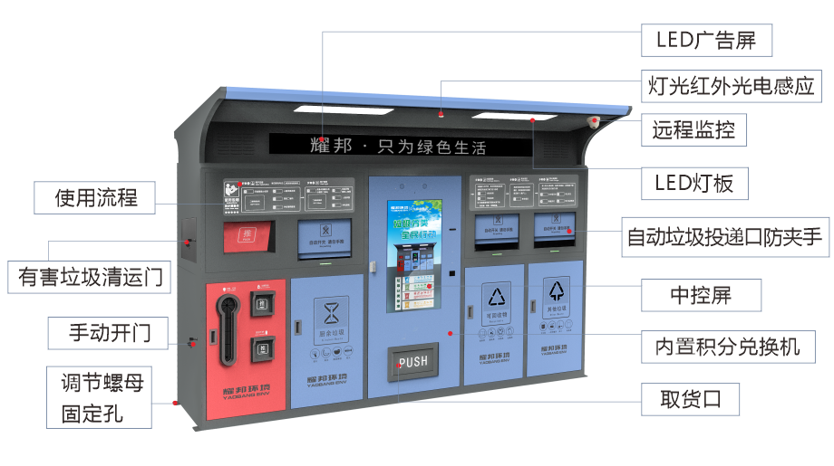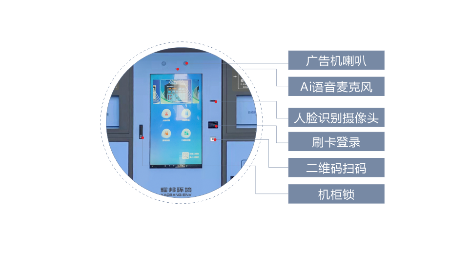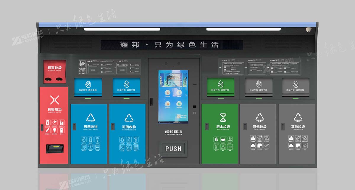 耀邦环境智能垃圾分类回收设备,依托先进的人工智能、大数据、物联网、云计算、AI等技术,对垃圾分类各环节进行智能化管理。该设备拥有人脸识别、二维码识别等多种体验方式,配置自动称重、智能投递、便捷照明、烟雾报警等功能。自主研发生产、外观精致时尚、科技感爆棚,引领垃圾分类新潮流。
